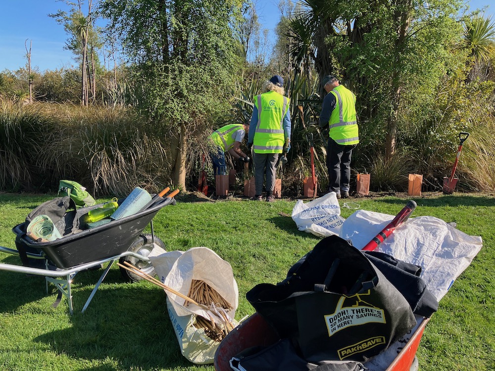 Today’s volunteer group is at Ōtukaikino Reserve, a 13 hectare “hidden gem” wetland in Belfast, with cultural and environmental significance. It’s also known as a Living Memorial, where bereaved families can donate plants in memory of loved ones. With oversight from the reserve’s ranger Matthew Brosnahan, the CVNZ volunteer party are digging in native grasses along a rather muddy streambank.